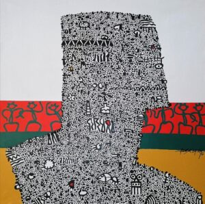 The medium used for this piece is acrylic on canvas, with dimensions measuring 28 by 29 inches. The composition features two decorative abstract heads with elongated bodies adorned in a mesmerizing array of dots, colours, symbols, and patterns. Adding to their allure, the dolls wear colourful Afro earrings that accentuate the magnificence of African aesthetics.