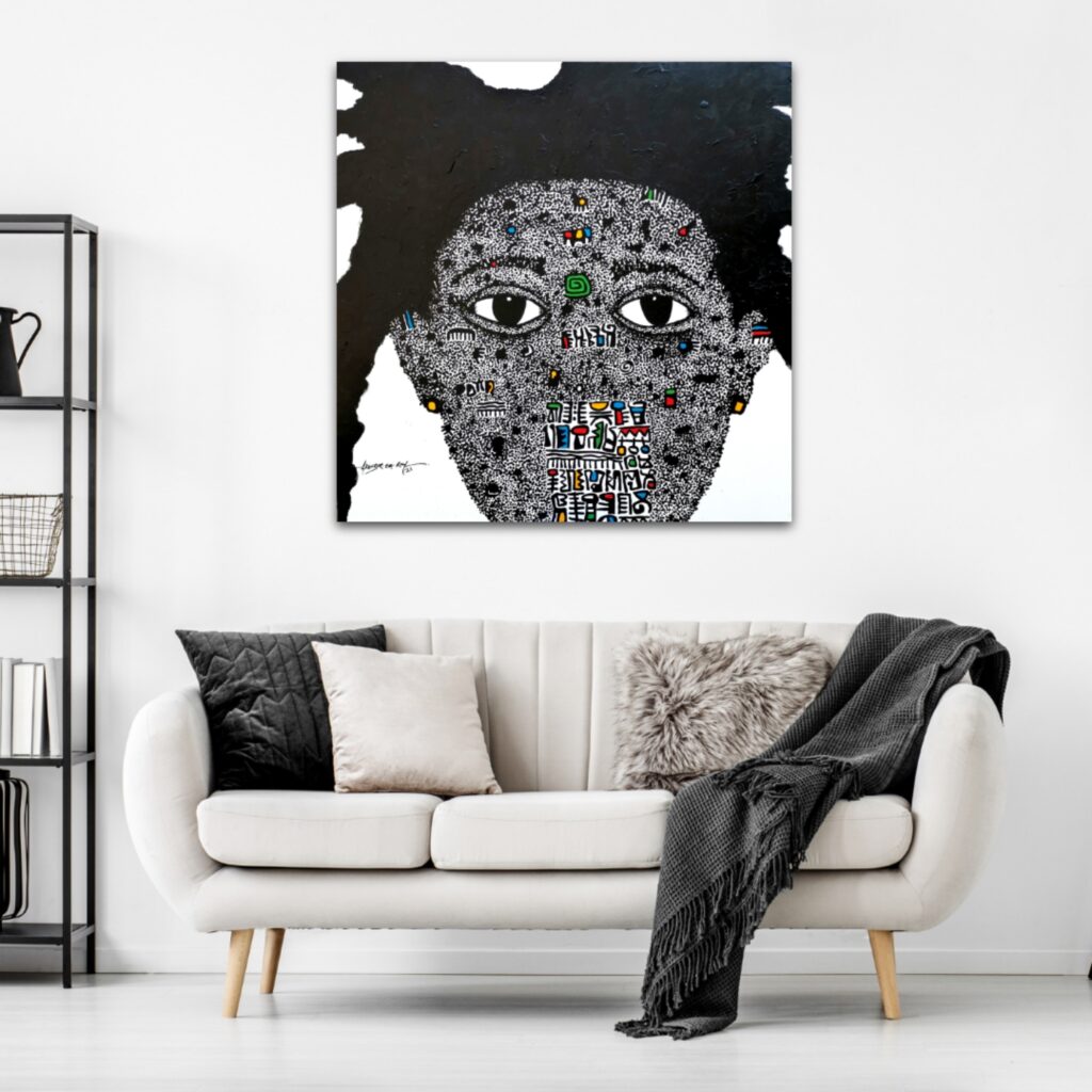 Black Vogue 1 is more than just a work of art; it is a reflection of my surroundings—a bold statement that captures the essence of a thriving African style and fashion. At its heart lies the composition of a male portrait adorned with a striking dreadlock hairstyle, meticulously painted with black dots and vibrant symbols. Created using acrylic on canvas, this contemporary African painting measures an impressive 54 by 54 inches.
