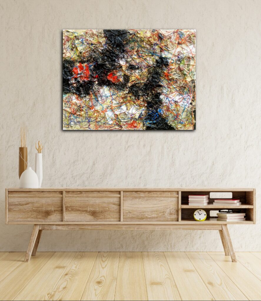In the captivating masterpiece titled “Garden of Thoughts 1,” my artistic journey takes flight as I delve into the realms of abstract expression and experimentation. This mixed media painting, measuring 36 by 48 inches, is a living tapestry of yarns, newspapers, tissue papers, foil papers, and acrylic on canvas—a harmonious fusion of diverse elements that breathe life into the canvas.