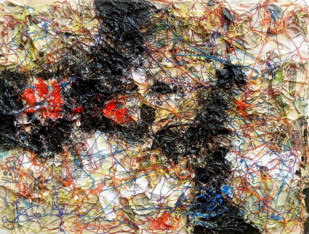 Amongst the intricacies of this creation, I decided to incorporate cowries, for they had long lingered in my mind as a cherished addition to my experimental pieces. Far beyond mere objects, I envisioned them as radiant hues that effortlessly complement the entire composition. They dance gracefully amidst the other elements, seamlessly blending with the yarns and papers, adding a touch of symbolism to the eclectic symphony of colours and textures.