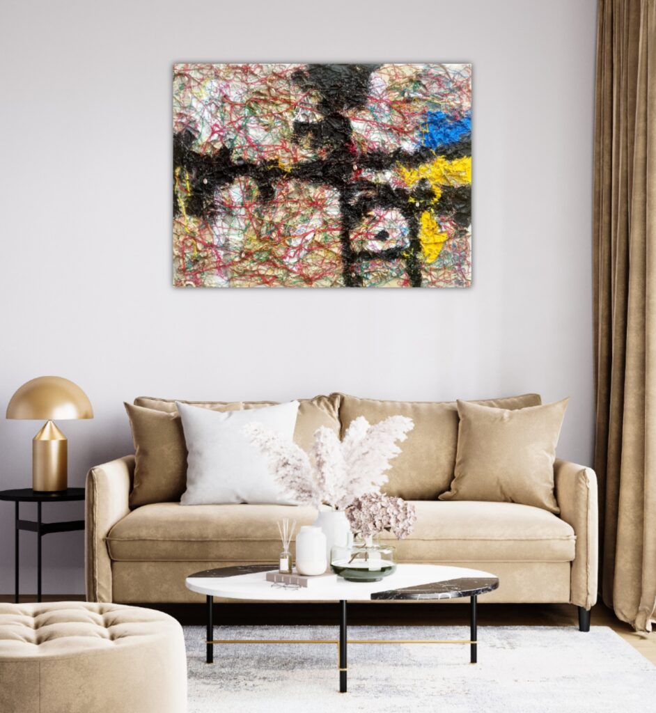 Garden Of Thoughts II stands as a will to this ongoing quest. As a contemporary African mixed media painting, it boasts dimensions of 32 by 48 inches, commanding attention and inviting the viewer to immerse themselves in its intricate details. It is a captivating tapestry of materials meticulously selected for their ability to convey my sensations and encapsulate my daily thoughts and struggles.
