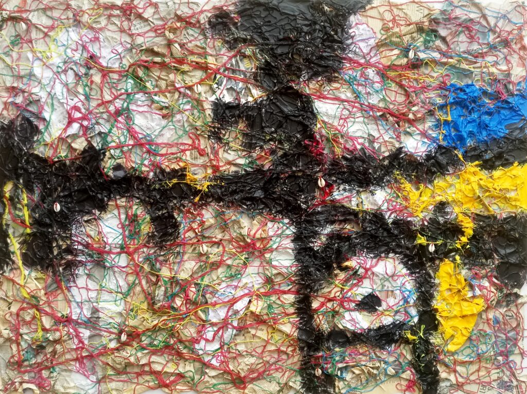 Upon closer examination, one can spot the delicate arrangement of cowries, yarns, newspapers, papers, cartons, and foil papers, all harmoniously intertwined with acrylic on canvas. Each element carries its own significance, contributing to the overall narrative of the artwork. The cowries, symbolizing prosperity and spirituality in African culture, add a touch of ancient wisdom to the contemporary composition. The yarns, meticulously woven and intertwined, represent the intricate threads of my thoughts and experiences, interconnecting to form a tapestry of my existence.