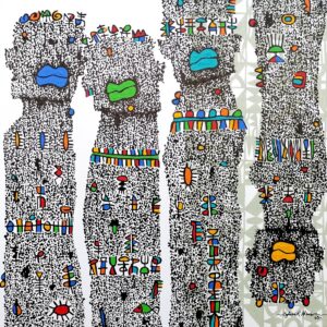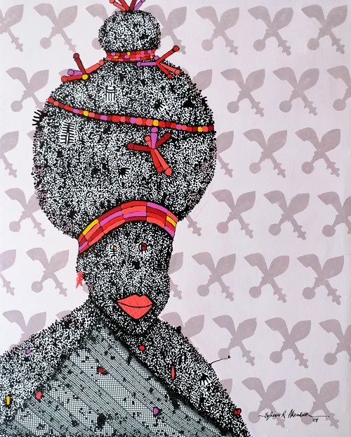 Royalty (Olohi) 3, this painting is an experimental documentation of the Queens of the Benin empire, one of the oldest empire in west Africa. Olohi means Queen in Benin language, the Oba (king) of Benin is known to have more than one Queen and they are adored with this kind of hair styles which is called okuku. In those days the hair style was only particular to the Queen and the palace, it was an abomination to done by anyone.