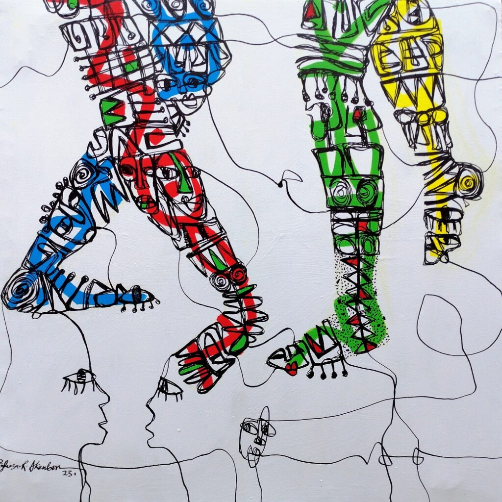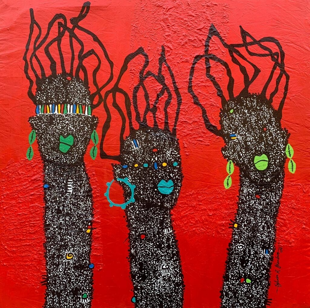 In my abstract painting series titled “Aproko Squared,” I delve into the vibrant tapestry of female camaraderie, where gossip flows freely among three stylized abstract figures. These women, depicted with elongated hairdos and slender necks, engage in spirited conversations about their daily lives and experiences. Drawing inspiration from the lively social dynamics of our society,