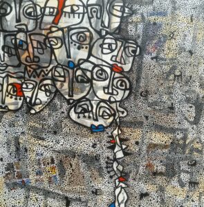 In this painting, a female portrait with yellow glasses is set against a background of grey imagery, symbols, and patterns. The composition is rich with dots, symbols, and motifs that come together to form an intricate tapestry of colours. The background is a kaleidoscope of abstract poetry, woven in hues and shades, with an imaginative story to tell.