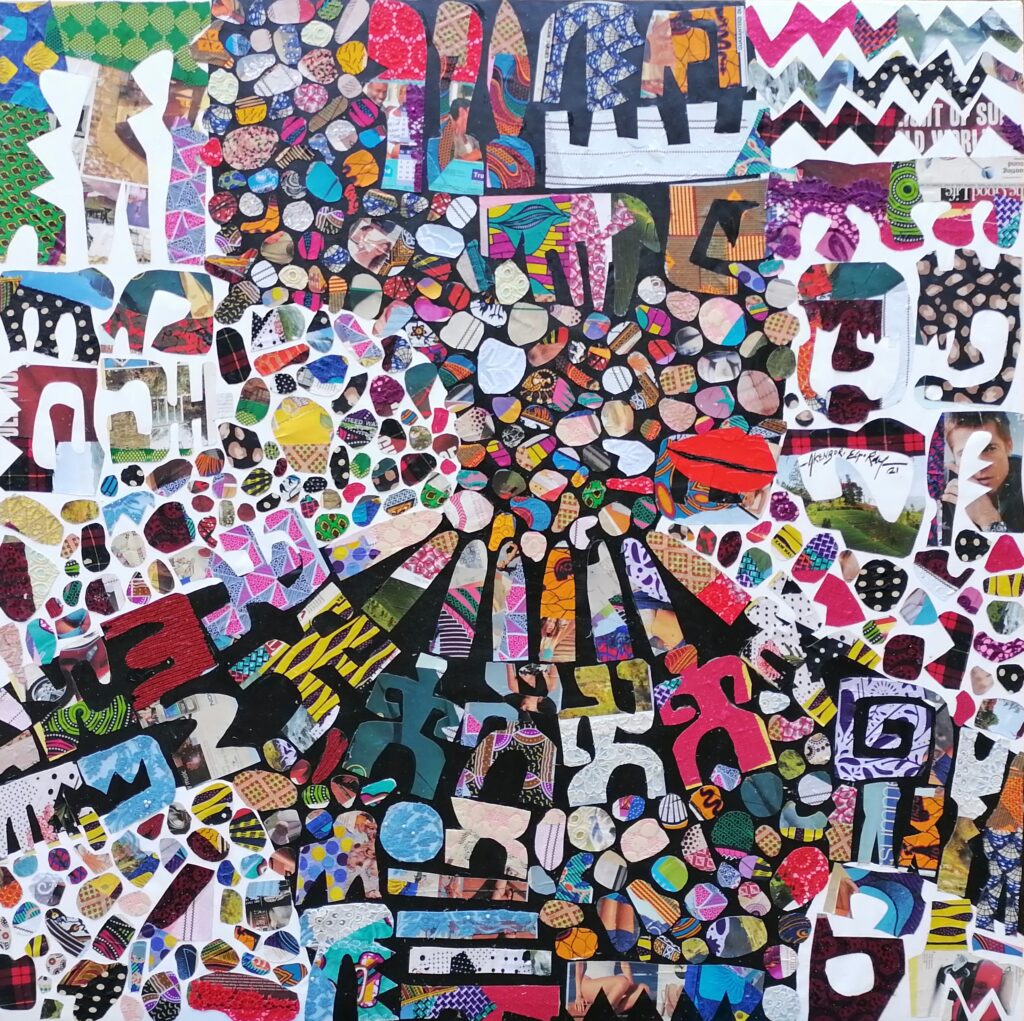 The painting is a series of colourful patterns, designs, and images that blend together to create a visually stunning and thought-provoking piece of art. My creative approach was to be experimental in my use of materials, taking me away from a routine process of creating art, and giving me the freedom to explore my imagination.