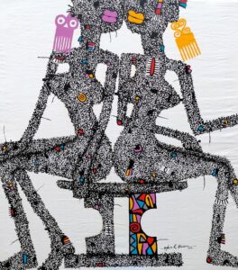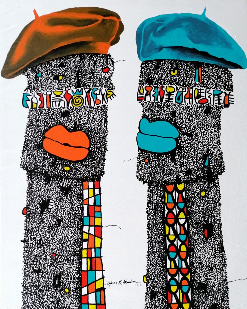 This painting series, titled “Guy Whatsup 1,” features an acrylic painting on canvas with dimensions of 60 by 48 inches. The artwork is the first in a collection of totem figures wearing colourful berets. Interestingly, the title of the painting came to me after the collection was completed. The two totem figures depicted in the painting give the impression of a conversation between two guys. “Guy Whatsup” is a colloquial phrase that guys use to check in with each other, often accompanied by a handshake.